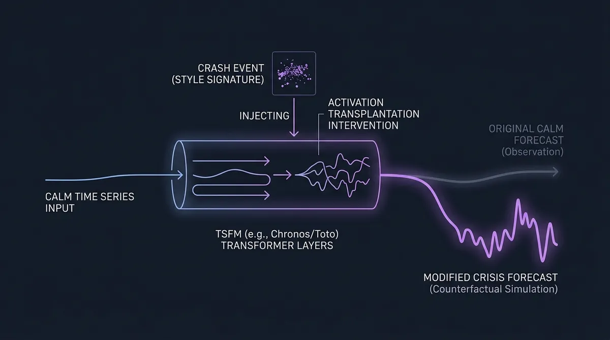 The results are striking. Injecting crash statistics into a calm period's hidden states deterministically induces downturn predictions. Injecting calm statistics into a crash period suppresses the crash forecast and restores stability. This works bidirectionally and consistently across two architecturally distinct TSFMs: Toto (decoder-only) and Chronos (encoder-decoder, 8M–710M parameters).