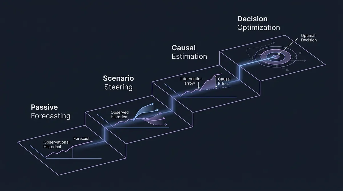 TSFMs were built to predict. The research covered here is the beginning of something more ambitious: TSFMs that can reason about interventions, steer scenarios, and ultimately contribute to decision-making systems. The path from passive prediction to decision support is long, and the evidence so far is preliminary. But for the first time, we can see concrete technical approaches that connect forecasting to causal reasoning within the same model family. The foundation models are useful for prediction. The open question is whether they can learn to answer the harder question: what should we do?