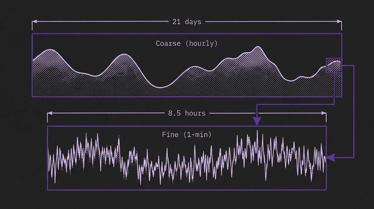 Cisco's CTSM 1.0 takes a different approach to long context: instead of extending the sequence length, it feeds the model two views of the same history at different resolutions — coarse hourly context for global patterns, fine minute-level context for local detail. On observability data the approach leads MASE by 16%, and on GIFT-Eval it lands third without test-set leakage.