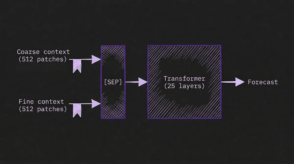 Resolution embeddings. Each input patch receives a learned embedding that indicates whether it belongs to the coarse or fine context. This is conceptually similar to the frequency embeddings in TimesFM, but the purpose is different: rather than encoding the sampling frequency metadata, the resolution embedding teaches the model that hourly and minute-level patches represent fundamentally different views of the data and should be interpreted differently.