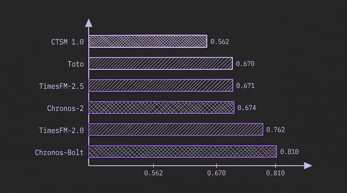 On GIFT-Eval with horizon capped at ≤128 and full context, CTSM 1.0 achieves a MASE of 0.715 — behind Chronos-2 (0.692) and TimesFM-2.5 (0.707), but ahead of TimesFM-2.0 (0.730), Toto (0.738), and Chronos-Bolt (0.749). Crucially, CTSM has no test-set leakage: the GIFT-Eval test set was explicitly excluded from training data. TimesFM-2.0 and Chronos-Bolt both have known leakage, and their reported MASE numbers should be read with that in mind.
