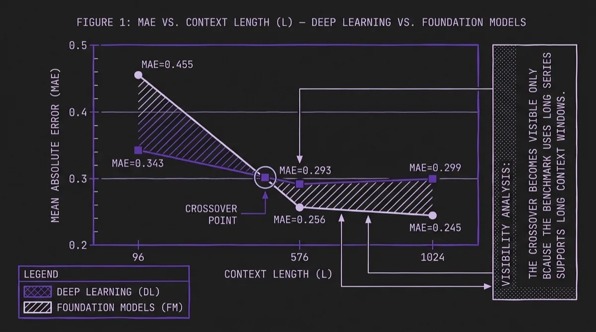 The paper does not present a mechanistic proof for why this crossover occurs, but the operational implication is still clear. Context length is not just a configuration choice driven by data availability or latency budget; in this benchmark it is also a model-selection signal. If you can provide L ≥ 576 steps of history, a foundation model is more likely to outperform a compact DL model. If you are constrained to L ≤ 96, the reverse is more likely to be true.