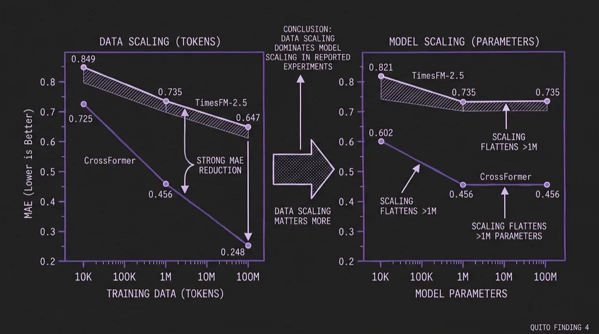 That result is especially actionable for Timer-S1-style large-scale pretraining investments. For a fixed compute budget, increasing training data appears more valuable than simply increasing parameter count, at least up to roughly ~200M parameters and ~100M tokens in this study.