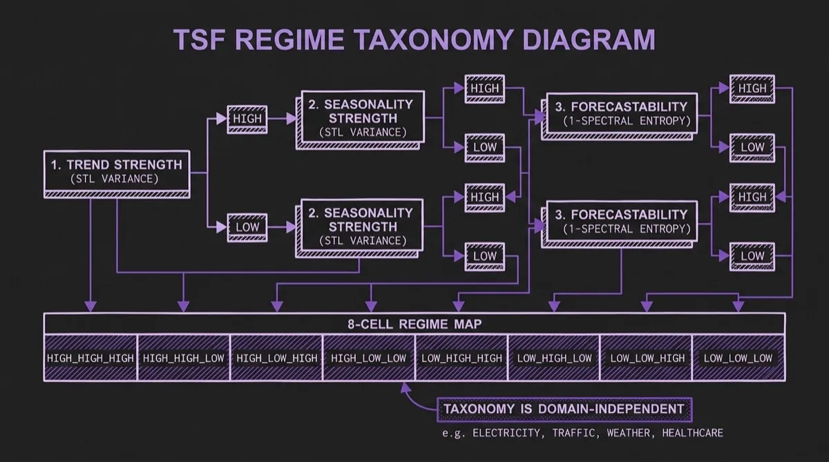 This taxonomy is explicitly designed to be independent of domain. An electricity series and a web traffic series can share the same TSF regime. Two series from the same domain can sit in very different regime cells. The paper's central argument is that regime cell is often more informative than domain label for understanding difficulty and model behavior.