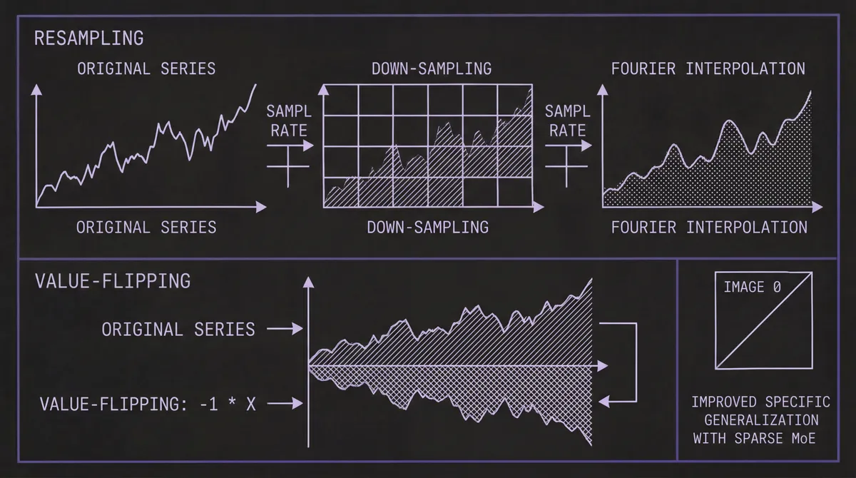 Value-flipping: Multiplying both input and output by –1 inverts trends while preserving temporal dependencies. This counteracts the model's tendency to latch onto persistent directional trends — a bias the team explicitly identified in their earlier Sundial work.