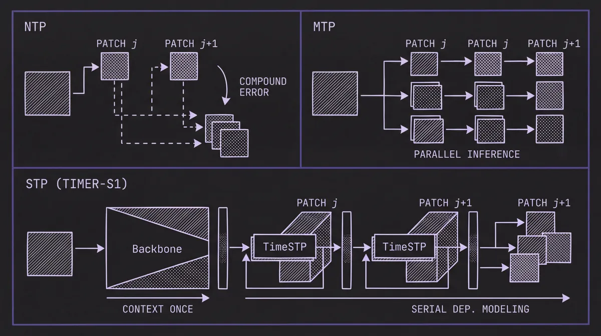 Timer-S1 introduces a third paradigm — Serial Token Prediction (STP) — that introduces serial computations for long-horizon accuracy while producing multi-step predictions in a single forward pass.