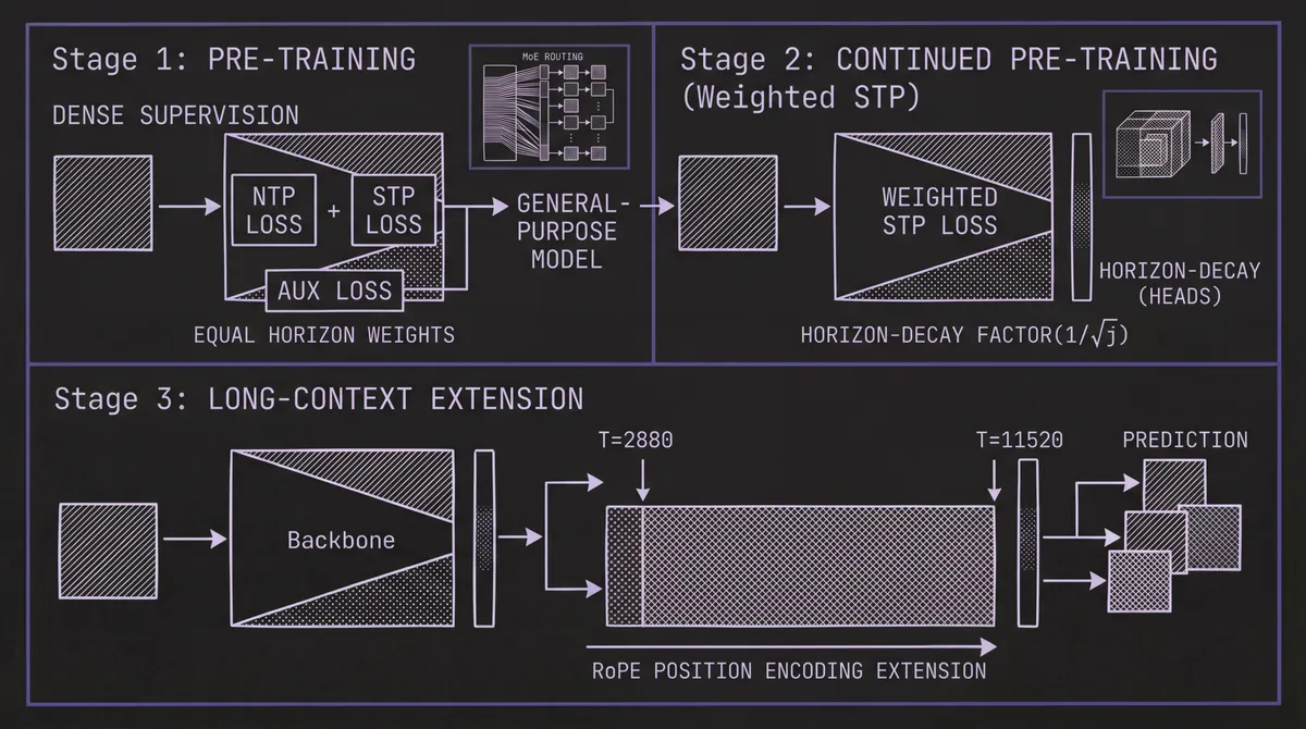 The model is trained on the full TimeBench corpus with the combined objective: NTP loss + STP loss + auxiliary MoE load-balancing loss, with equal weights across all horizons. Dense supervision is applied — each training sample generates multiple forecasting tasks with variable input and output lengths, maximizing sample efficiency. This stage produces a general-purpose model with uniform performance across horizons. Initial context length is T = 2,880 (180 patches × 16).
