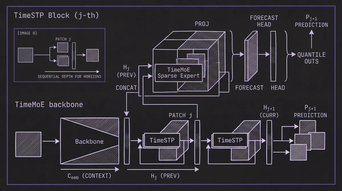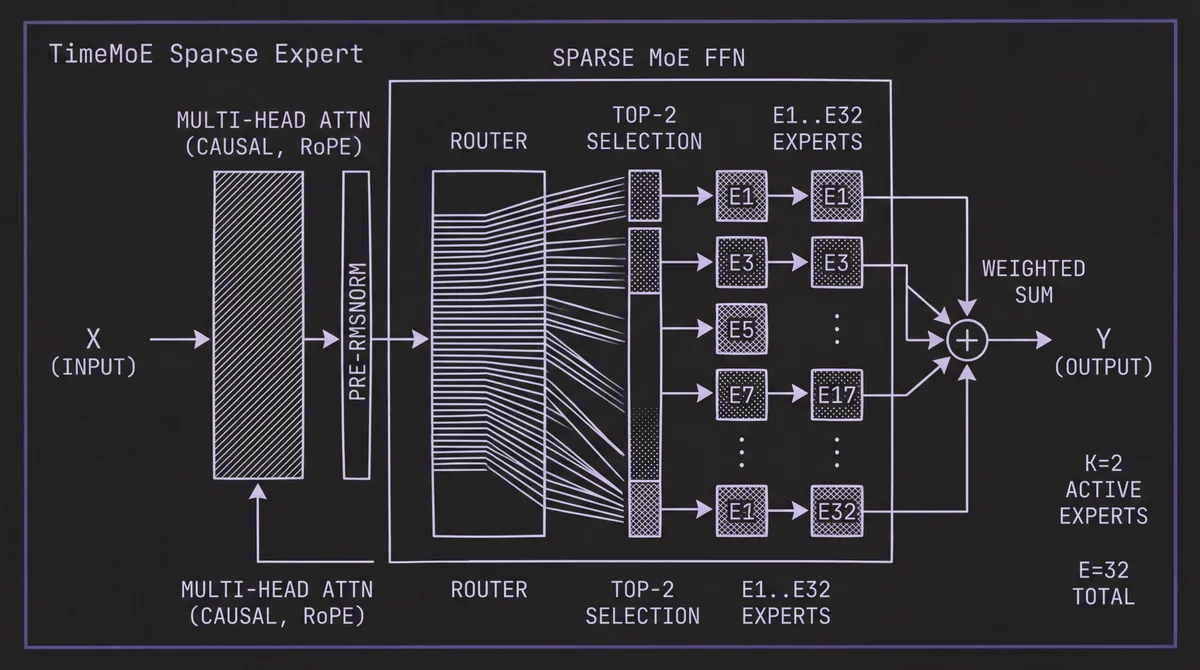 The sparse configuration means 8.3 billion total parameters with only 0.75 billion activated per token. The authors note this aligns with a key property of time series data: global heterogeneity (data from radically different domains) but local simplicity (each patch within a series has relatively straightforward patterns). The MoE structure lets the model store specialized knowledge for many domains without activating all of it for any single input.