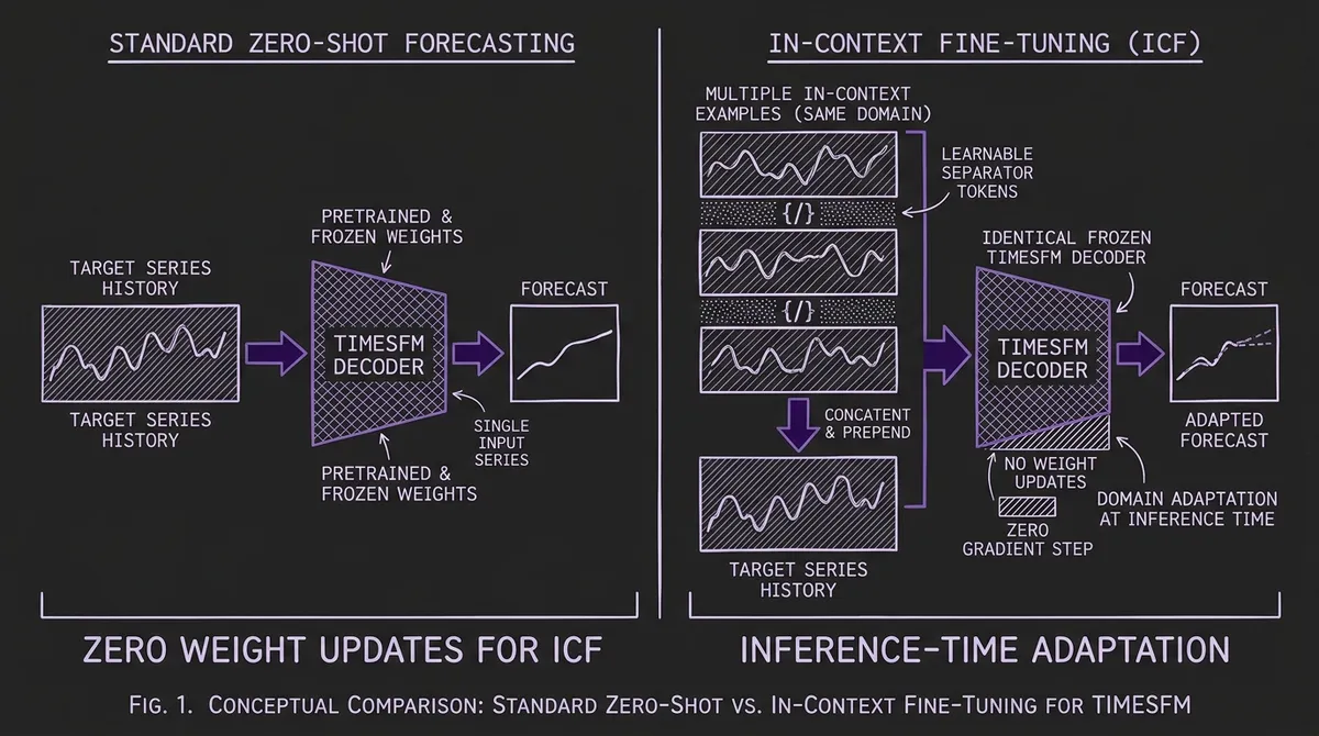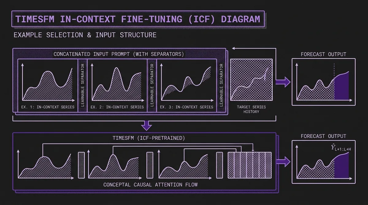 Google Research's In-Context Fine-Tuning (ICF) lets TimesFM adapt to new domains at inference time by prompting with related time series examples — no gradient updates, no training pipeline, roughly 7% better accuracy on aggregate across Monash benchmarks. Here's how it works and when to use it.